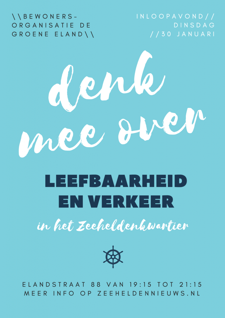 Kom dan naar de inloopbijeenkomst die De Groene Eland, de bewonersorganisatie van het Zeeheldenkwartier organiseert op dinsdag 30 januari, van 19.15 tot 21.15 uur in de Heldenhoek, Elandstraat 88a.